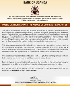 HomeBusinessBank of Uganda reminds the public that mutilating or defacing Uganda Shilling... BusinessEducationInvestment February 7, 2026 Updated: February 7, 2026 Bank of Uganda reminds the public that mutilating or defacing Uganda Shilling banknotes and coins is prohibited. By Bill Clinton Share FacebookTwitterPinterestWhatsApp - Advertisement - - Advertisement - TagsBank of UgandacoinsUganda Shilling banknotes Share FacebookTwitterPinterestWhatsApp Bill Clinton - Advertisement - Stay Connected 200FansLike150FollowersFollow600SubscribersSubscribe Must Read Official Statement Temporary breakdown of services at Mbarara regional office of National Citizen and Immigration Control due to a fibre cut Bill Clinton - February 10, 2026 - Advertisement - Regional News Kenya champions AU Commission budget oversight in continental reform drive February 9, 2026 Regional News Rwanda’s Kigali Digital ID Rollout a Boost for EAC Neighbors’ Cross-Border Travel and Trade February 9, 2026 Business Uganda Fast-Tracks Shs937B Power Link to Tanzania for Regional Energy Surge February 9, 2026 Related News Official Statement Temporary breakdown of services at Mbarara regional office of National Citizen and Immigration Control due to a fibre cut February 10, 2026 Regional News Kenya champions AU Commission budget oversight in continental reform drive February 9, 2026 Regional News Rwanda’s Kigali Digital ID Rollout a Boost for EAC Neighbors’ Cross-Border Travel and Trade February 9, 2026 Business Uganda Fast-Tracks Shs937B Power Link to Tanzania for Regional Energy Surge February 9, 2026 Investment Uganda and Tanzania Gear Up for Crude Oil Exports, Eye Regional Integration Boom February 9, 2026 - Advertisement - Leave a reply Cancel reply Comment: Please enter your comment! Name:* Please enter your name here Email:* You have entered an incorrect email address! Please enter your email address here Website: Save my name, email, and website in this browser for the next time I comment.