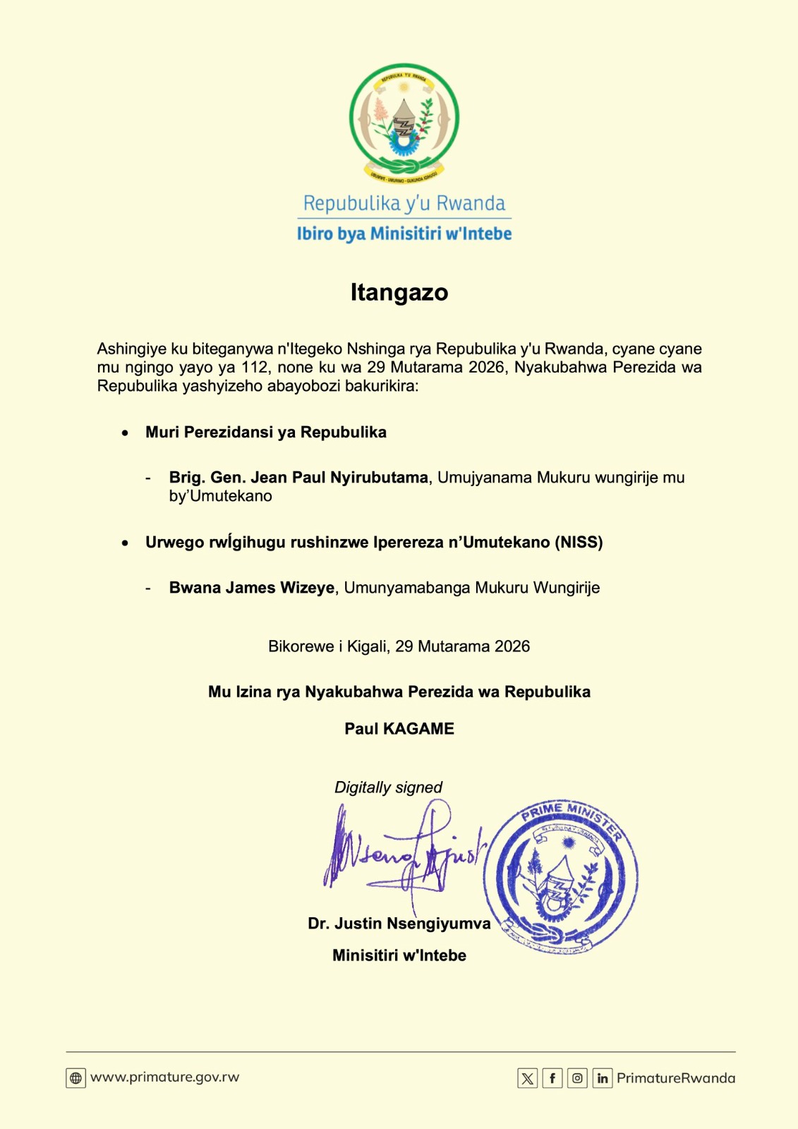 On January 29, 2026, the Office of the Prime Minister announced key appointments by President Paul Kagame, strengthening the Presidency’s defense and security advisory team.